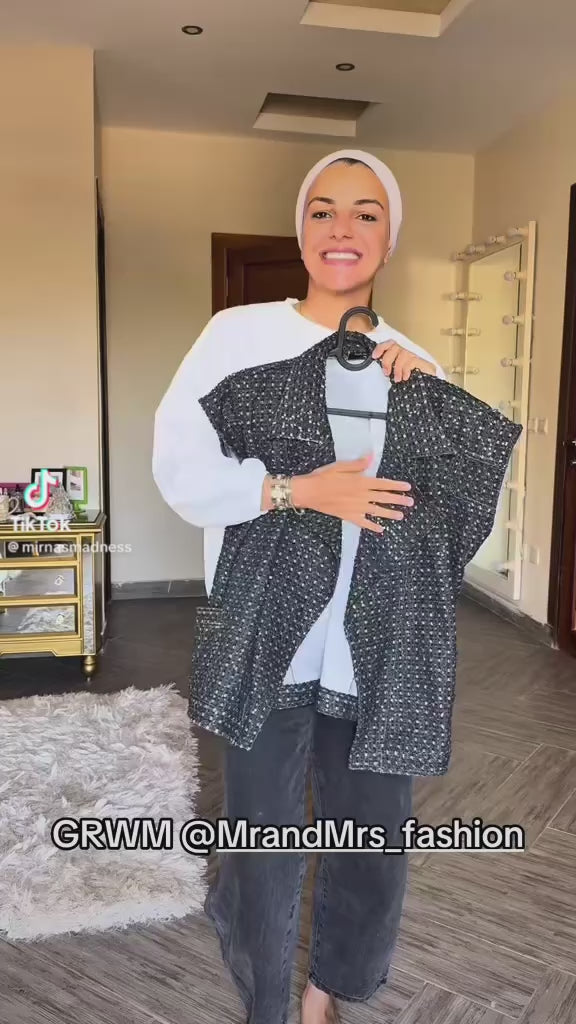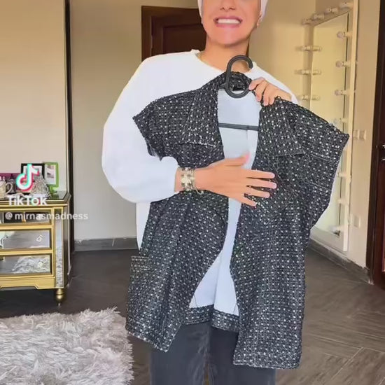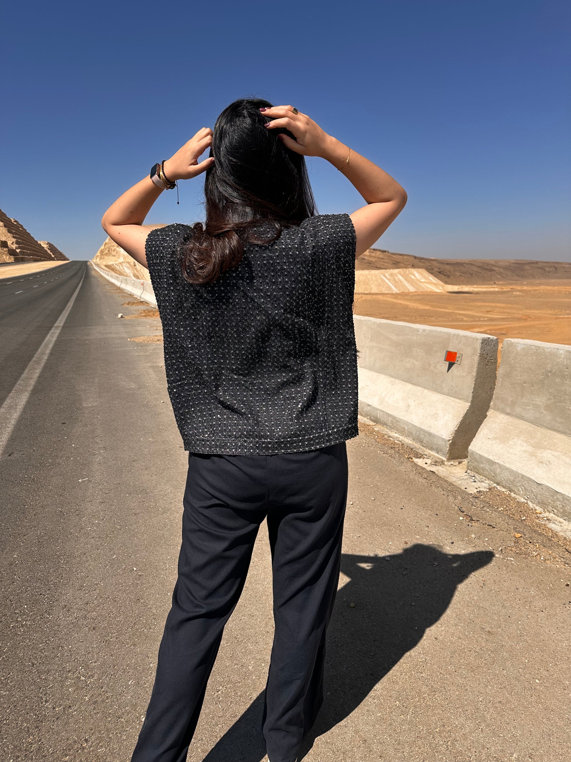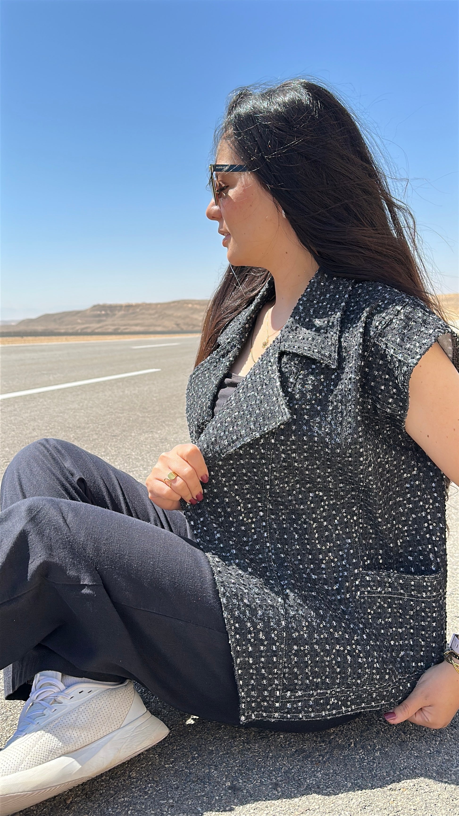 The Shimmer Denim Vest Crafted from textured black denim with a subtle glitter effect.